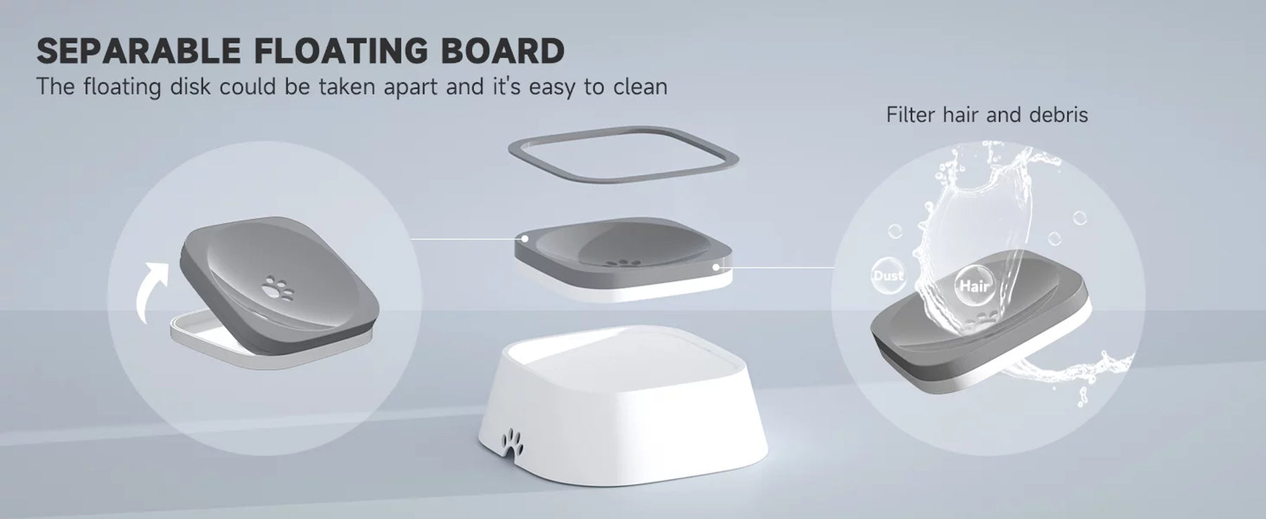 9. EASY TO CLEAN: The edge strip and floating disk are detachable, take apart the dog water bowl to clean. Rinse with water or put it on upper rack of dishwasher.